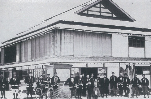 相模組本社落成時 相模家の⾃宅併⽤社屋として、信濃大町駅前(現在の明治安田生命大町営業所の場所)に建てた 相模組本社内部 左から2番目、こちらを⾒ているのが2代目社⻑の相模三蔵 |